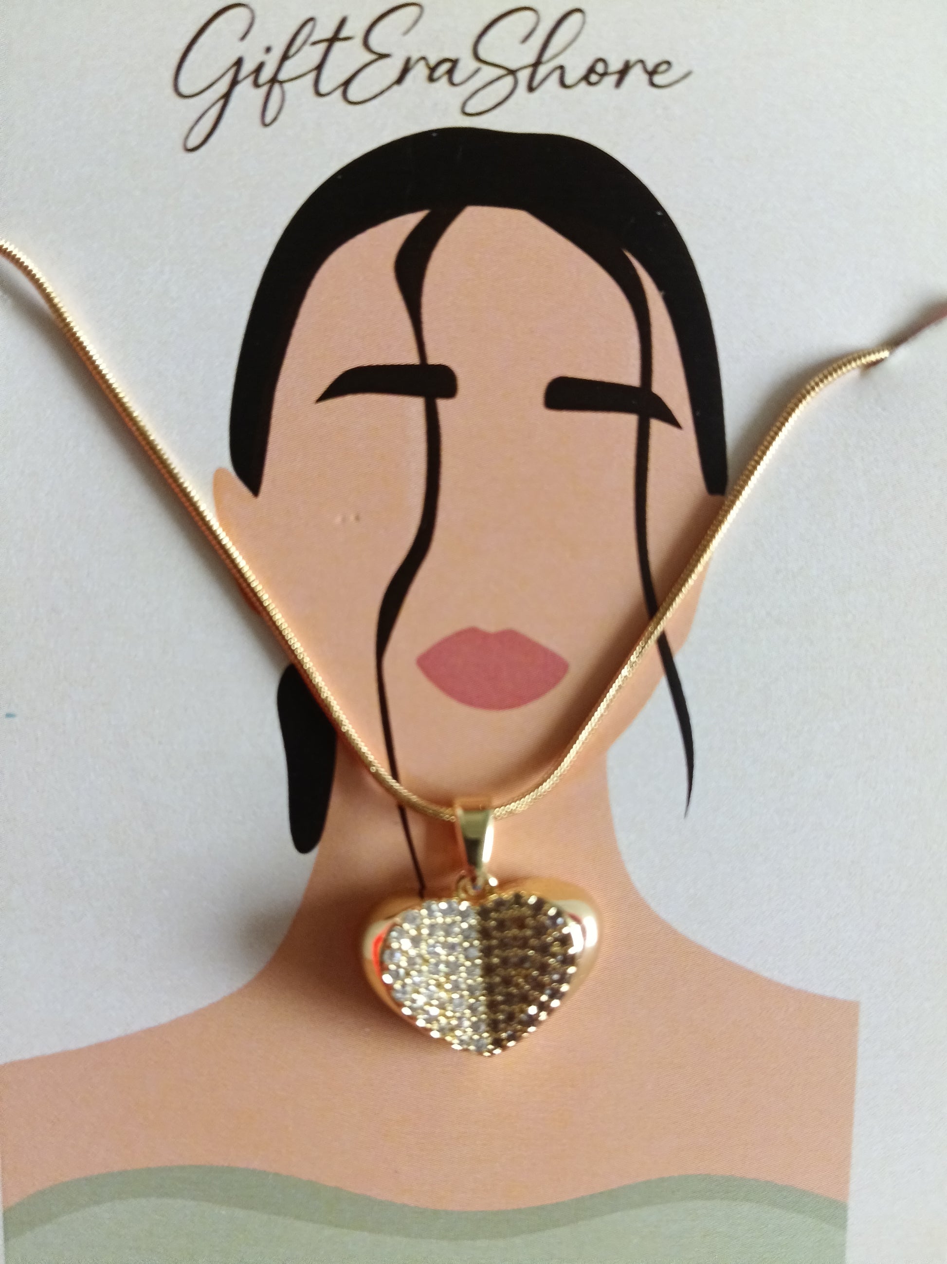 A striking gold-tone necklace with a heart pendant, featuring half its surface covered in sparkling pave crystals for a dazzling contrast.