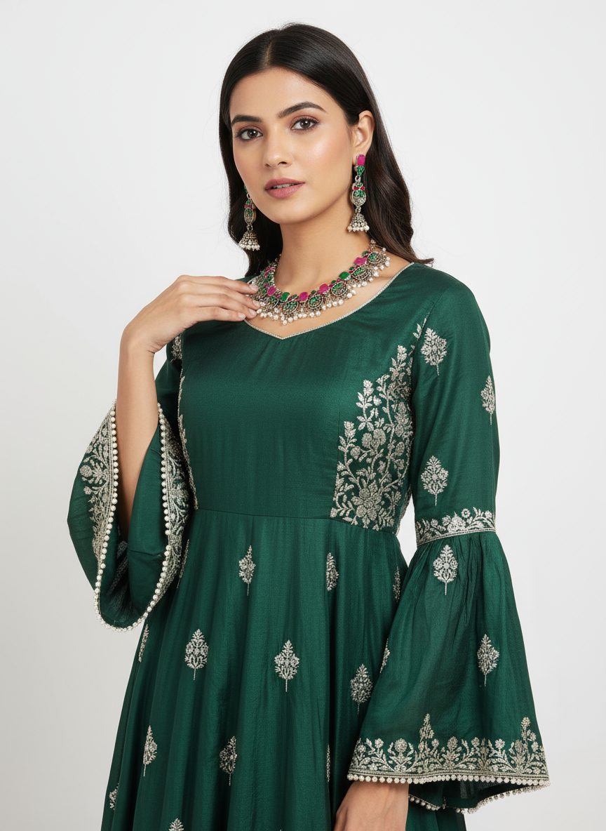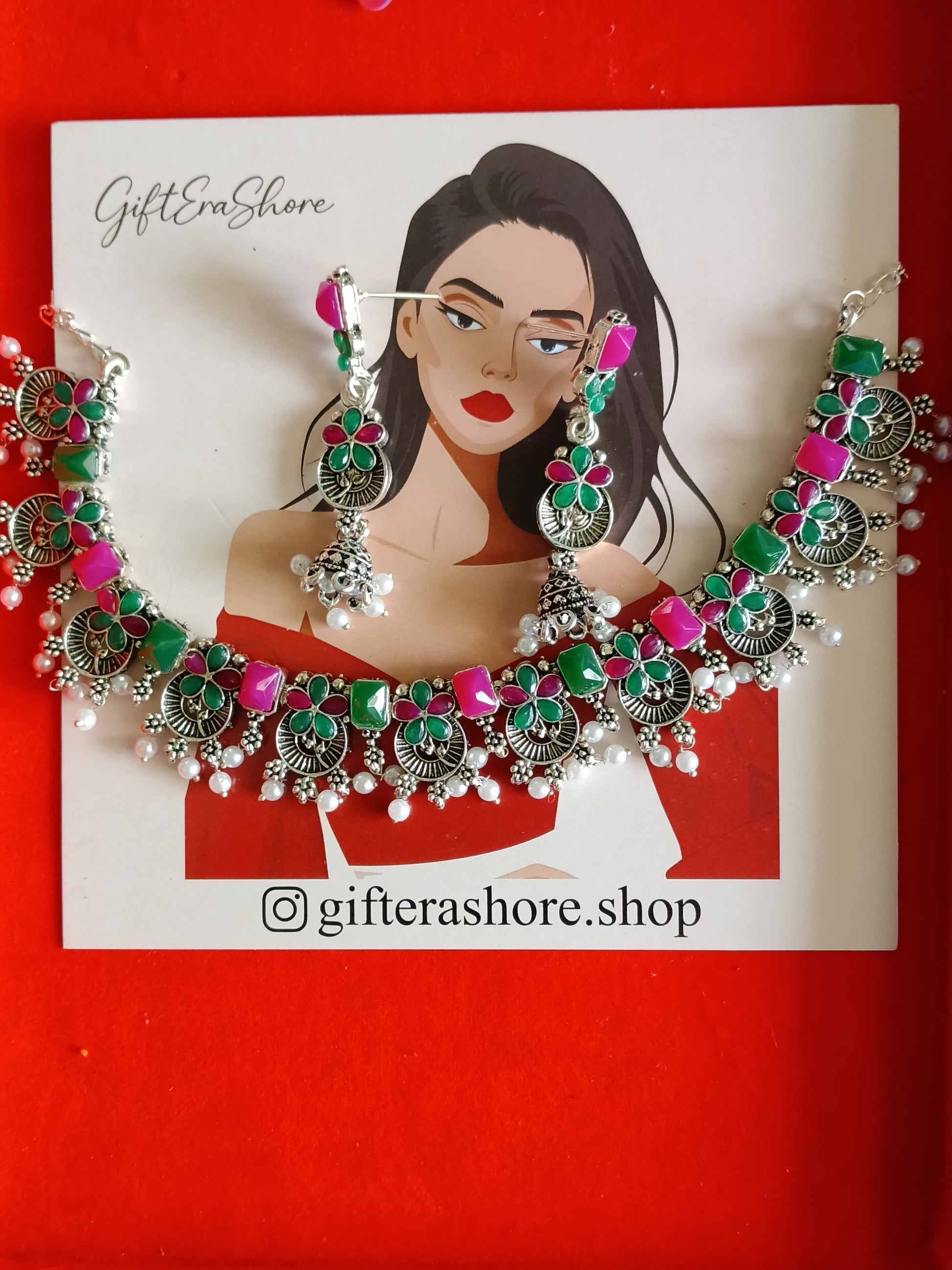 Beautifully detailed oxidised choker inspired by peacock motifs, decorated with green and pink stones. Comes with statement earrings for festive occasions.