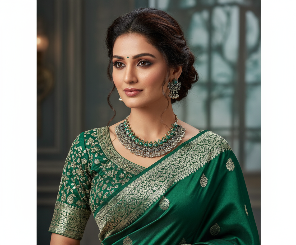 Heavy oxidized silver choker and jhumka earrings set, adorned with intricate floral motifs and colorful peacock feather enamel drops.